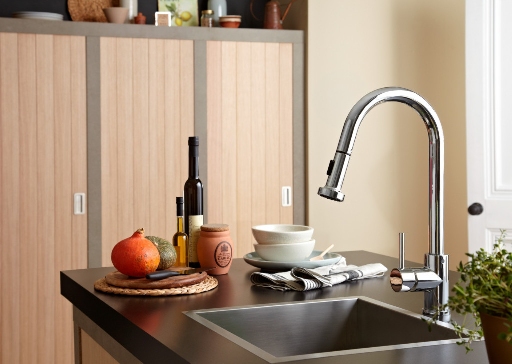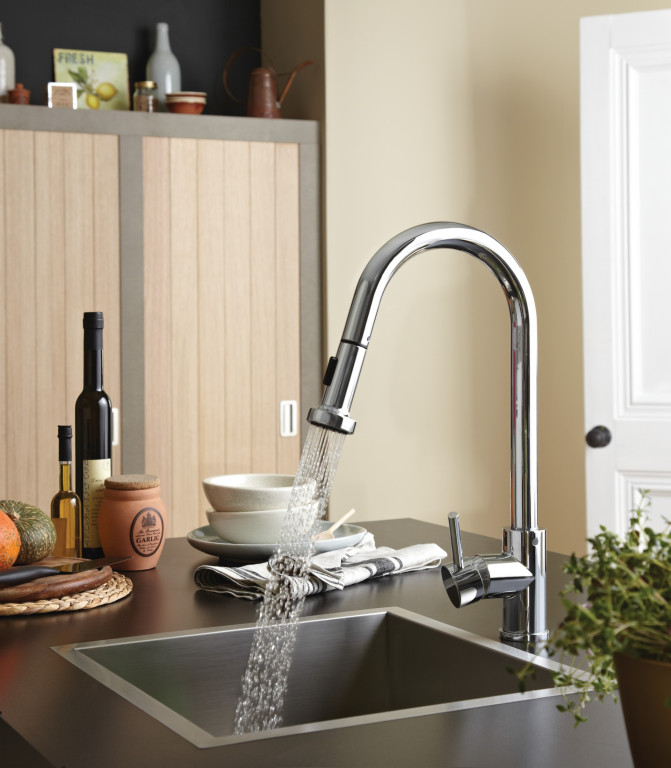 Smartly styled, the Apricot kitchen tap has a push-button operated spray function, making rinsing and washing food or dishes an easy job.