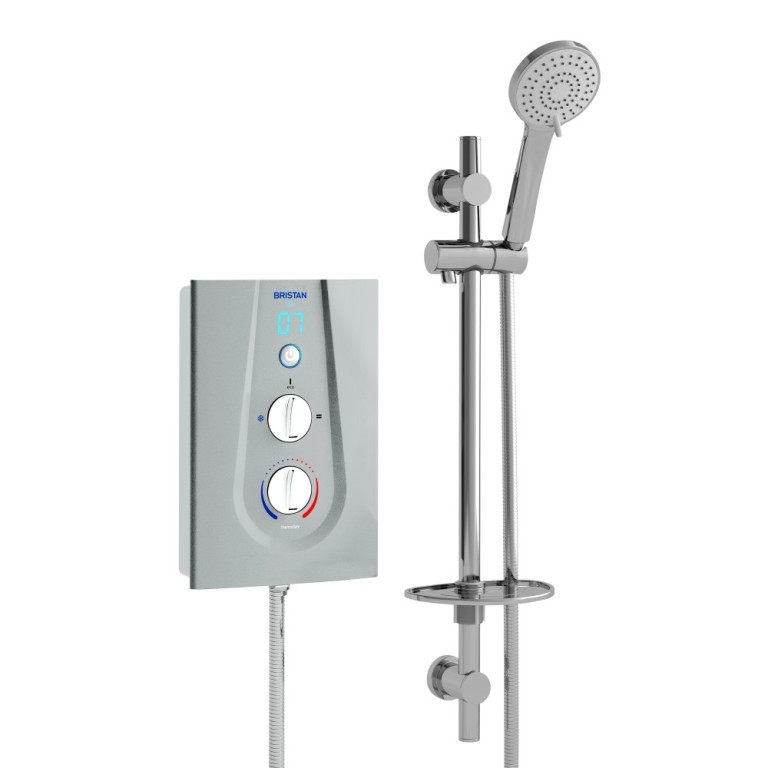 The Joy electric shower offers a modern design with the choice of white or stylish metallic silver finishes. Thermostatic technology means that your chosen water temperature will stay the same for the duration of your shower, regardless of other things going on in your house such as someone flushing the loo. A push on/off button and separate flow and temperature dials are easy to operate. Its universal footprint means that it will cover the space left by your old shower, saving you the hassle of re-tiling.