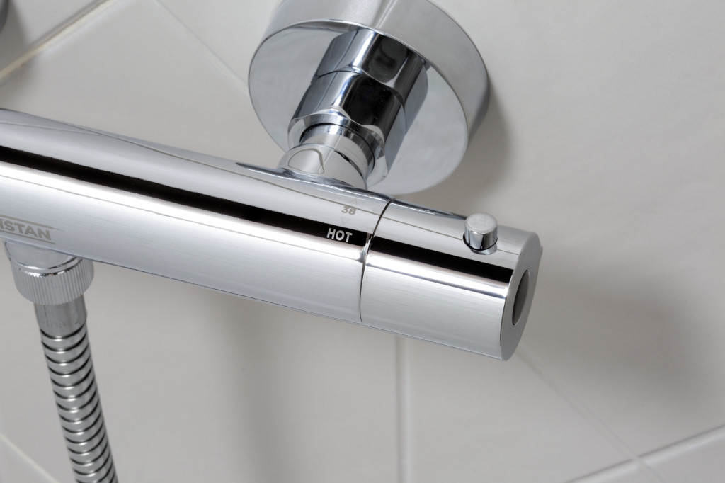 Thermostatic cartridge with preset temperature safety stop at 38°C for family-safe showering. A higher temperature can be selected, if required, by selecting the override function.